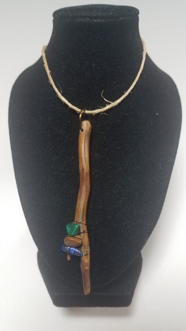Assembled with Manzanita stained brown with green wood filler in the cracks and Lapis Lazuli, Tigers Eye, and Malachite copper wire wrapped stones.